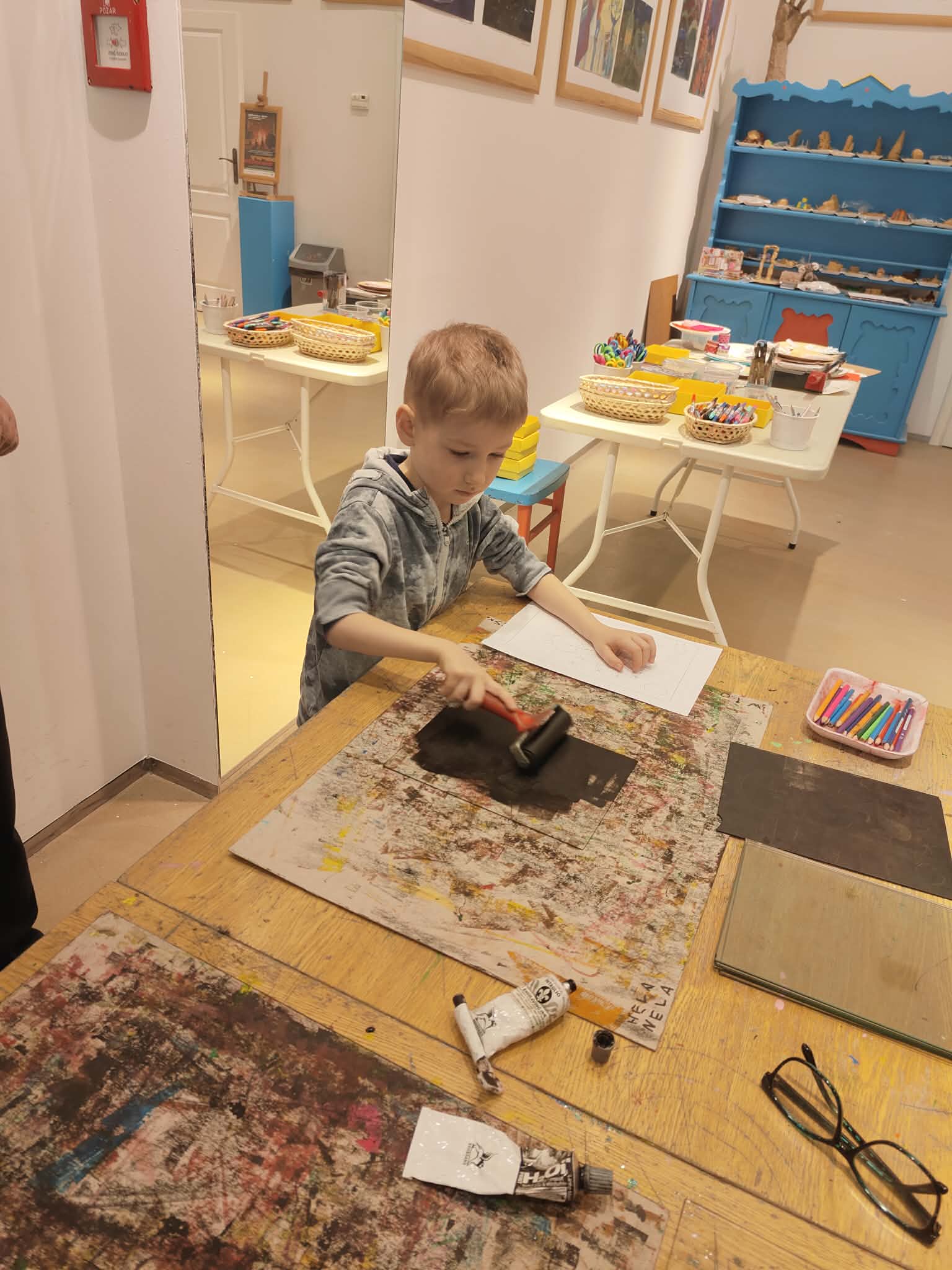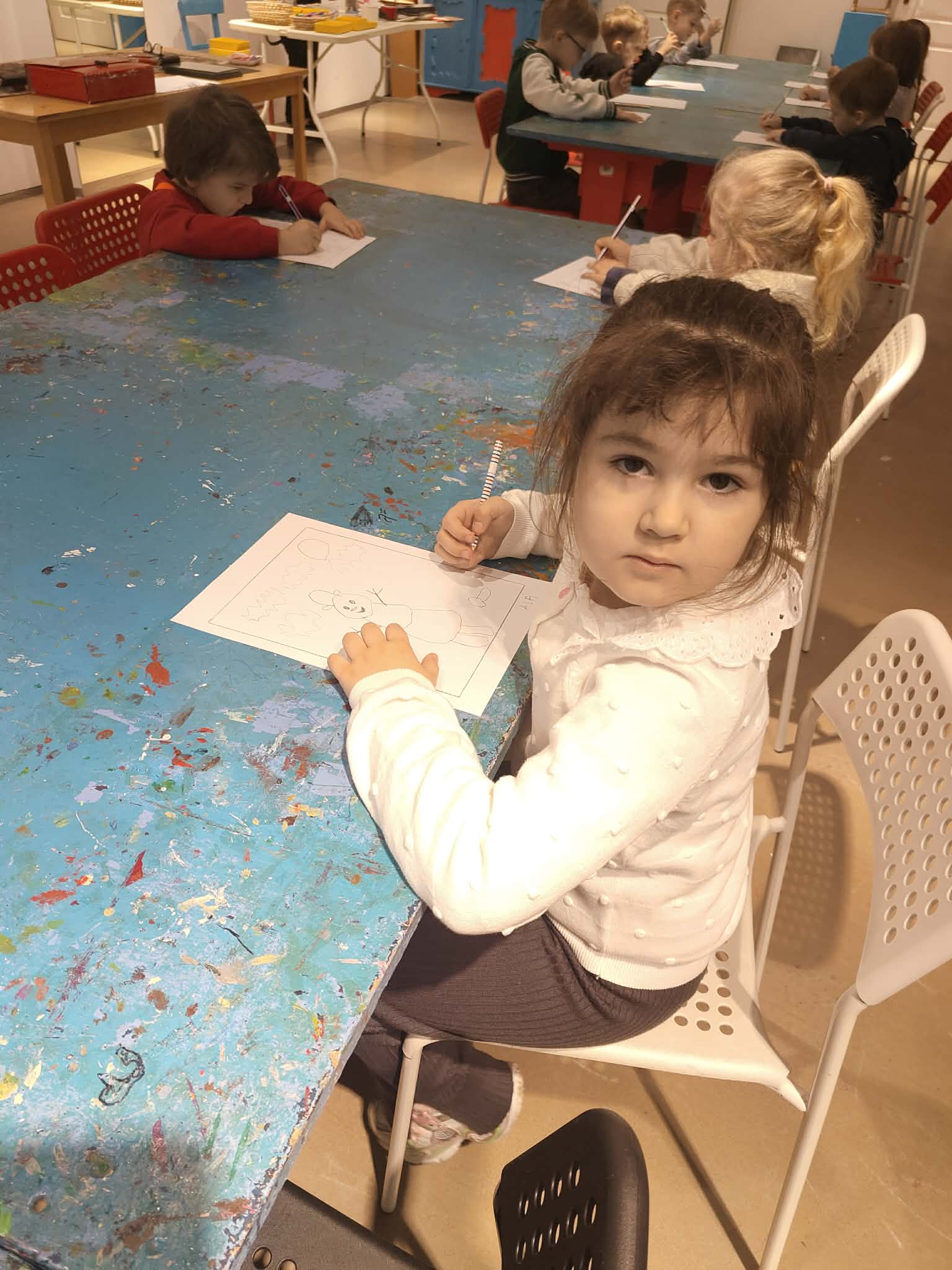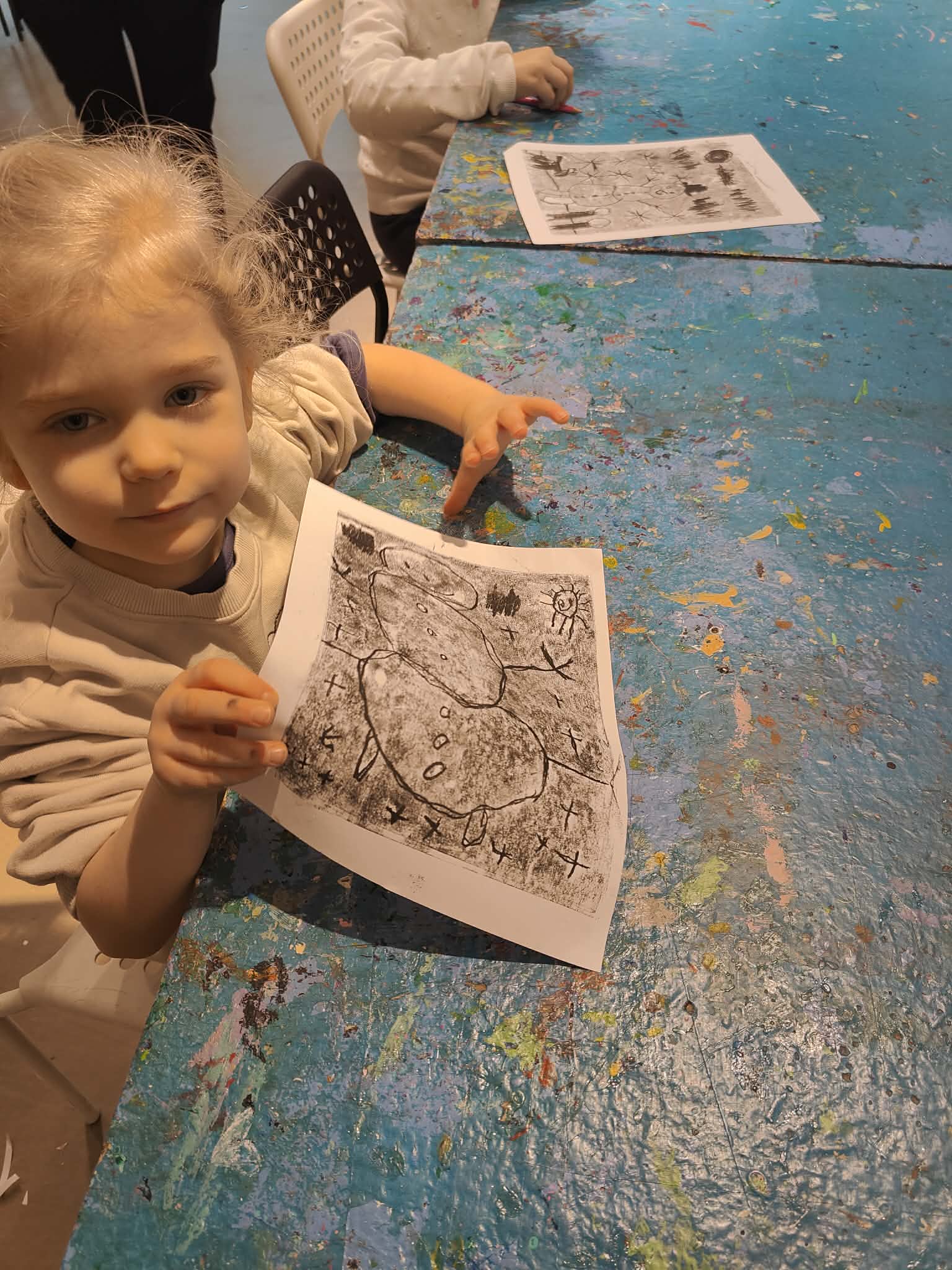 9 lutego dzieci z grupy Biedronki wybrały się do Pracowni Działań Twórczych „Kolor i Forma” w Galerii Wisła na warsztaty „Zimowe kolory i kształty”. Na początku spotkania Pani prowadząca serdecznie przywitała dzieci oraz zaprezentowała galerię obrazów wykonanych przez dzieci z różnych krajów. Następnie wytłumaczyła krok po kroku, jakie działania będą realizowane podczas warsztatów. W trakcie zajęć przedszkolaki najpierw narysowały ołówkiem zimowy pejzaż, a następnie tworzyły monotypię – technikę polegającą na pokryciu farbą szklanej matrycy i odbiciu jej na kartce papieru dzięki wałka. Dzięki tej metodzie powstały piękne, zimowe prace plastyczne. Dzieci wróciły do przedszkola bardzo zadowolone i pełne artystycznych wrażeń