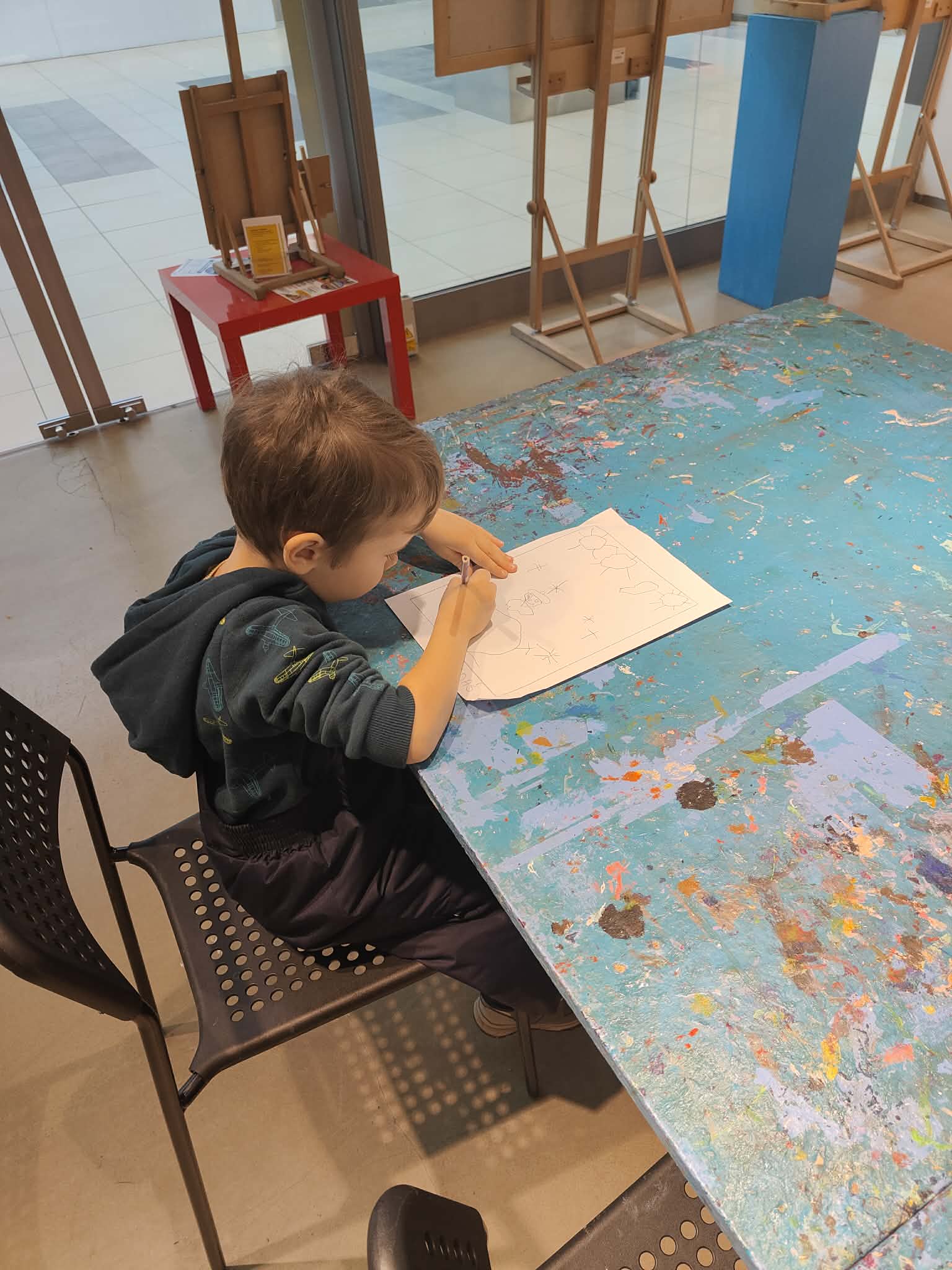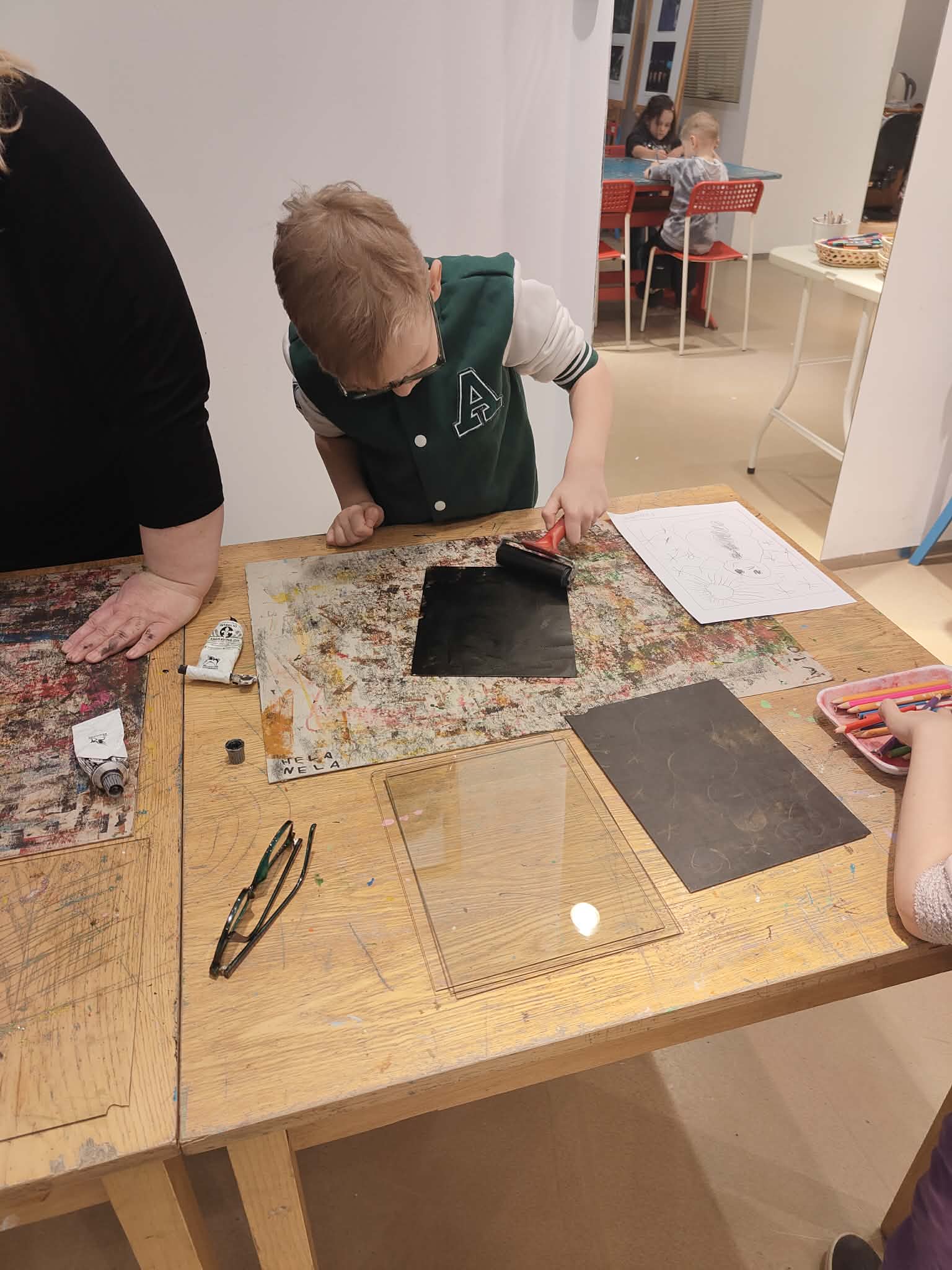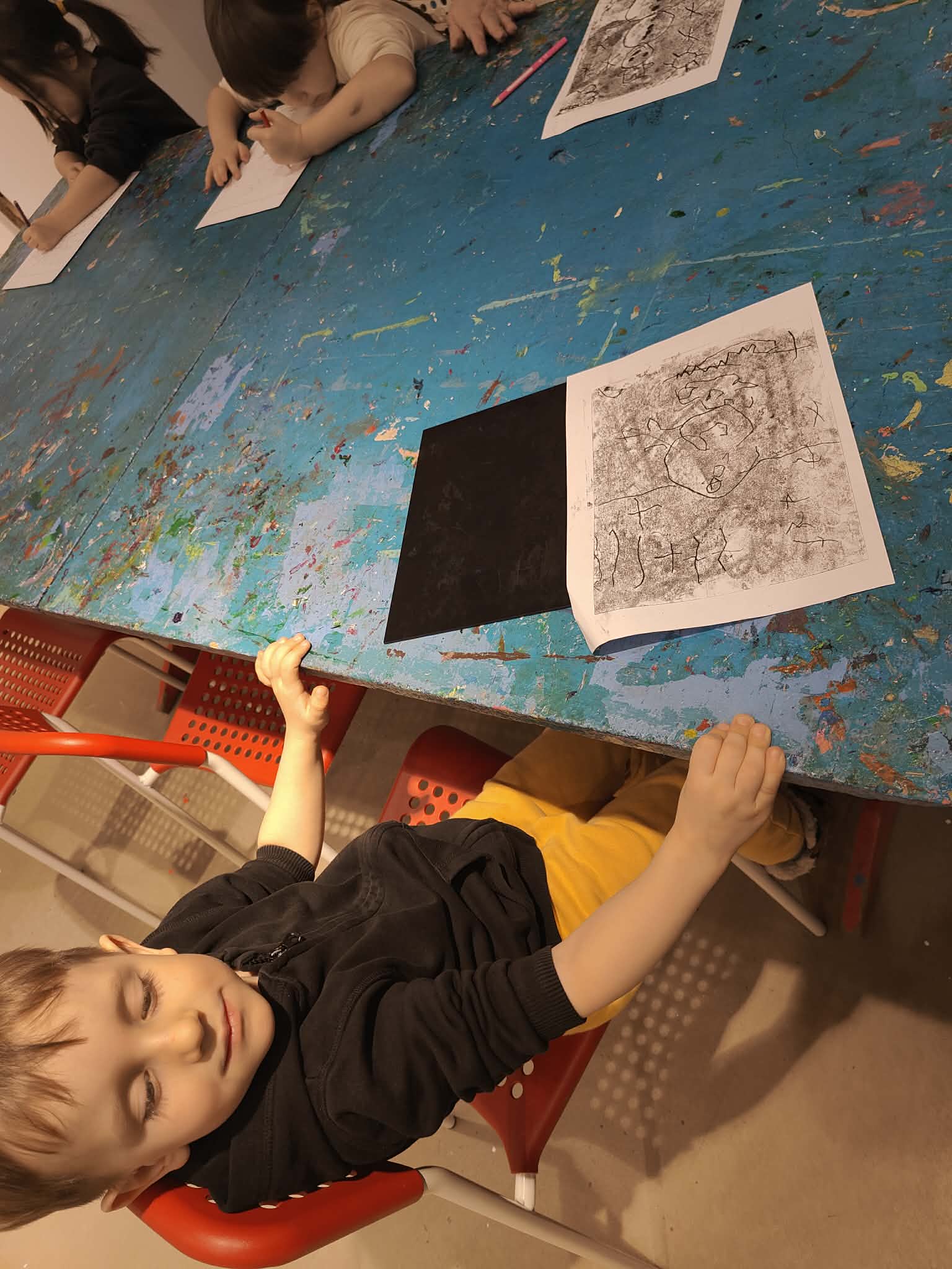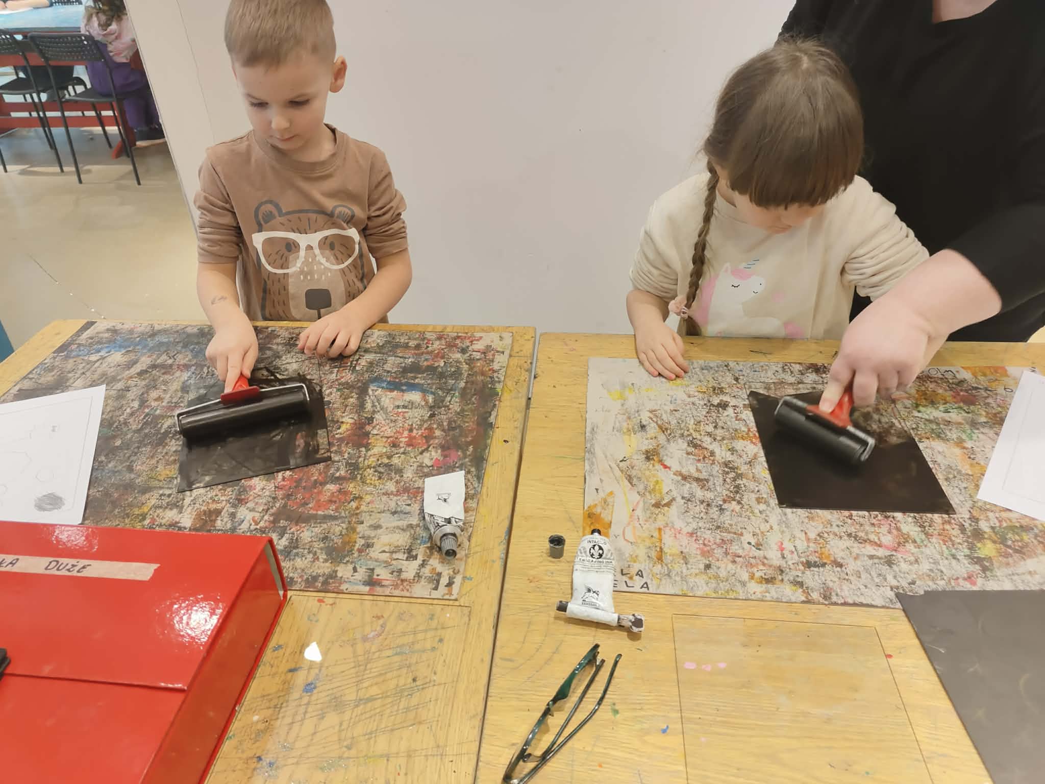 9 lutego dzieci z grupy Biedronki wybrały się do Pracowni Działań Twórczych „Kolor i Forma” w Galerii Wisła na warsztaty „Zimowe kolory i kształty”. Na początku spotkania Pani prowadząca serdecznie przywitała dzieci oraz zaprezentowała galerię obrazów wykonanych przez dzieci z różnych krajów. Następnie wytłumaczyła krok po kroku, jakie działania będą realizowane podczas warsztatów. W trakcie zajęć przedszkolaki najpierw narysowały ołówkiem zimowy pejzaż, a następnie tworzyły monotypię – technikę polegającą na pokryciu farbą szklanej matrycy i odbiciu jej na kartce papieru dzięki wałka. Dzięki tej metodzie powstały piękne, zimowe prace plastyczne. Dzieci wróciły do przedszkola bardzo zadowolone i pełne artystycznych wrażeń