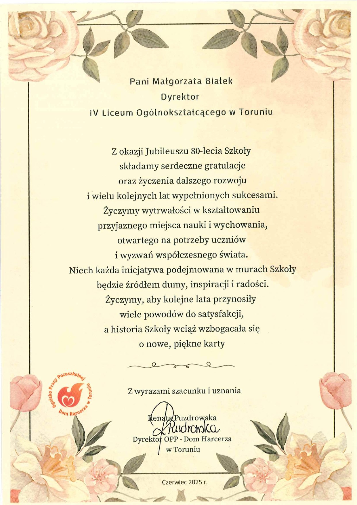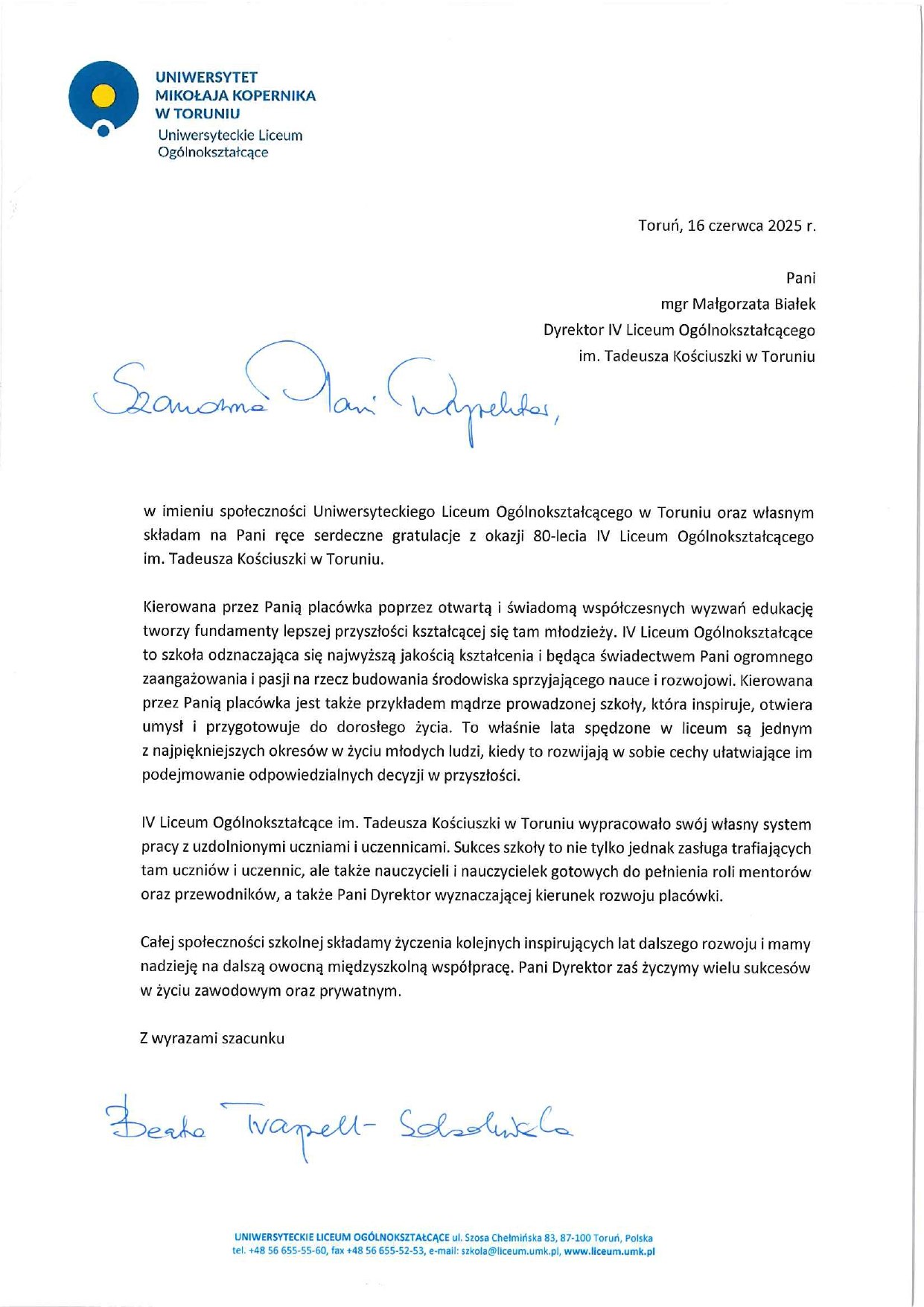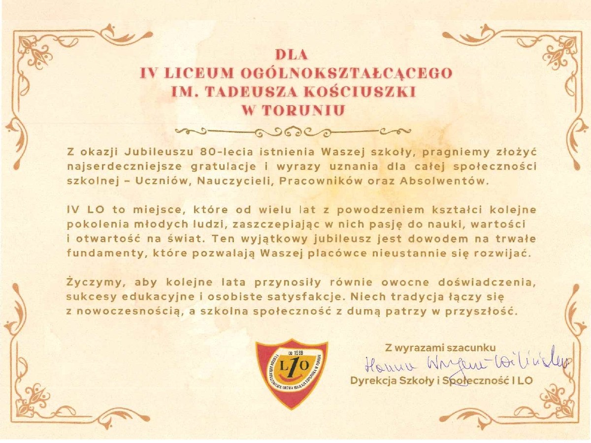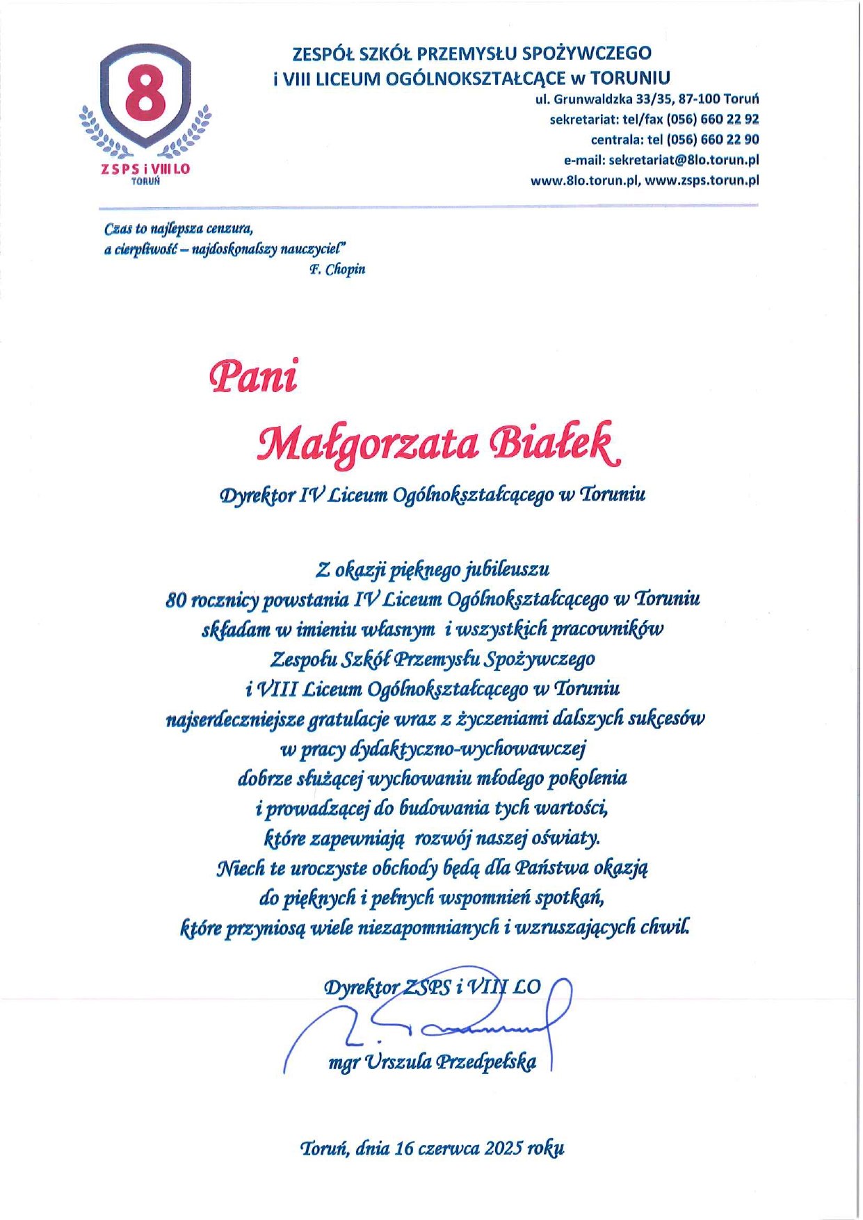 Z okazji 80-lecia naszej szkoły otrzymaliśmy wiele ciepłych słów, gratulacji i wyrazów uznania od instytucji, władz i przyjaciół szkoły. Część z nich prezentujemy w poniższej galerii – z dumą i wdzięcznością…
