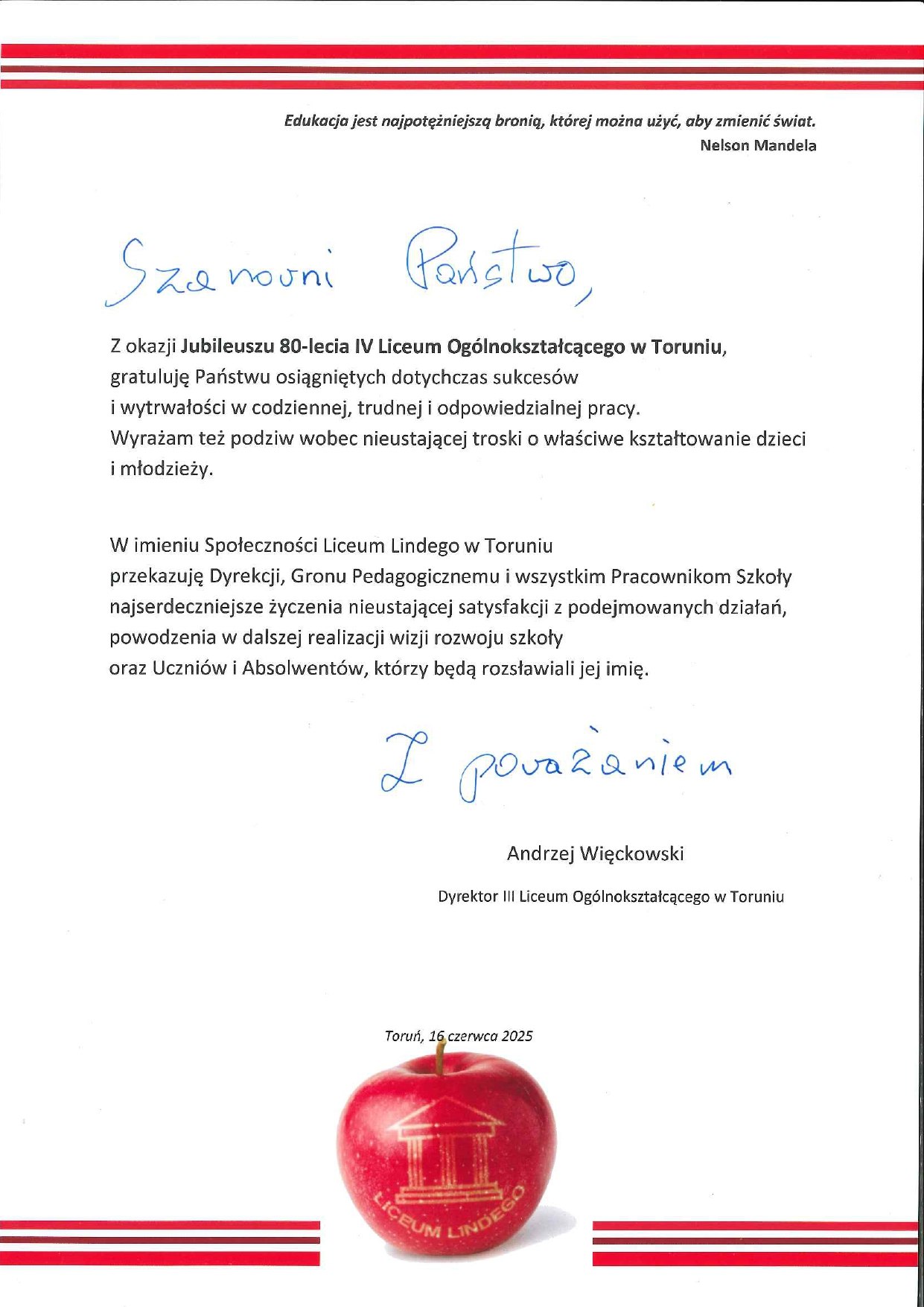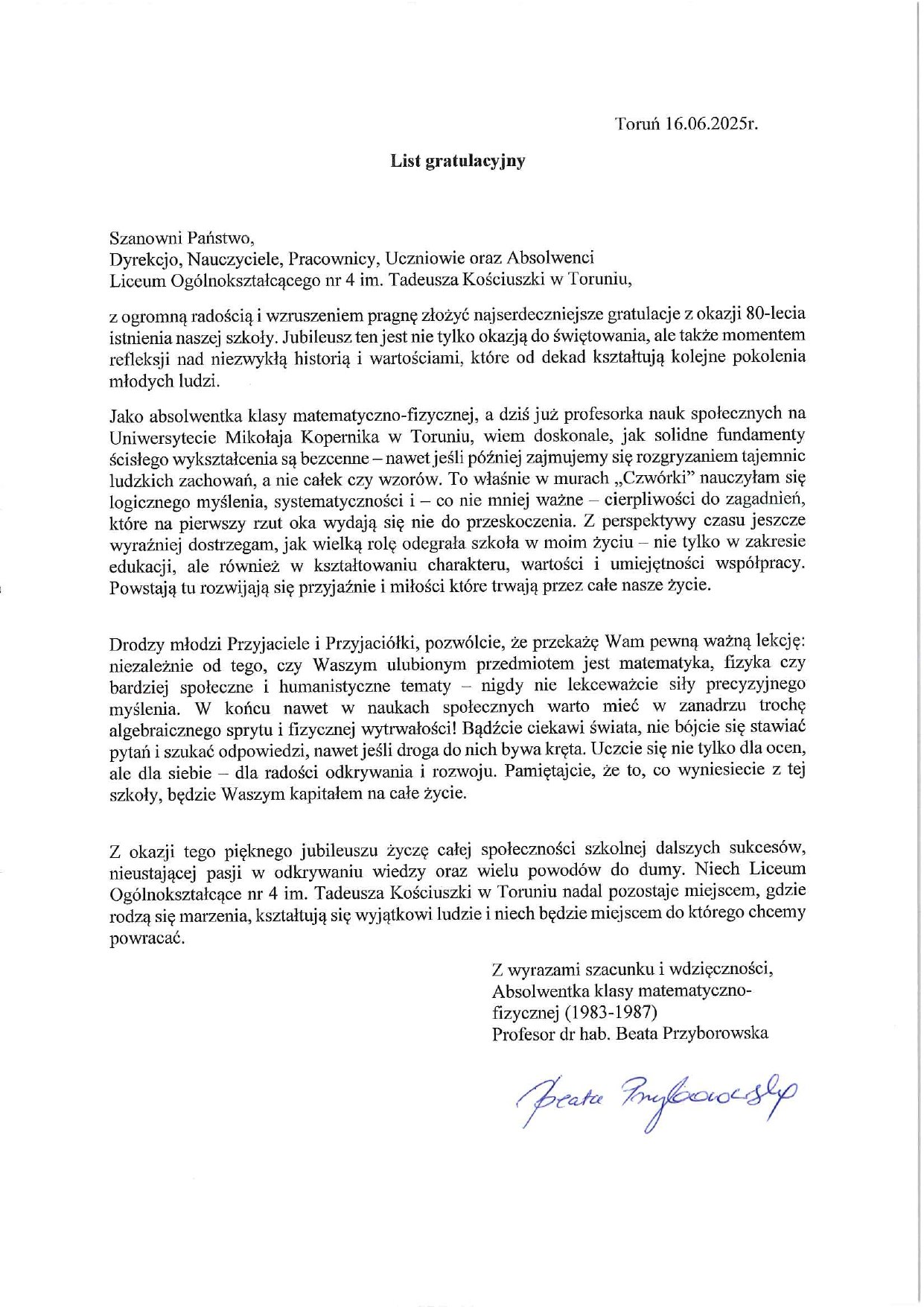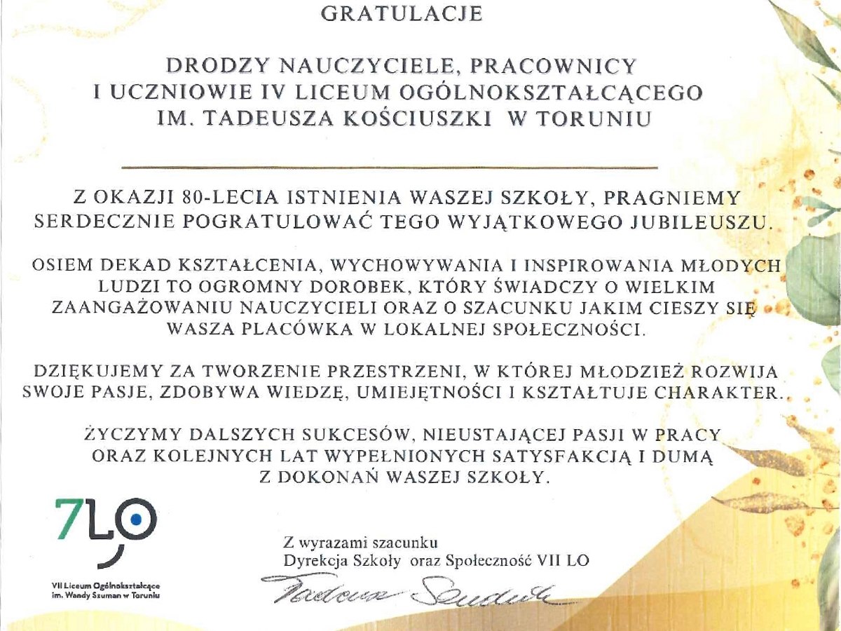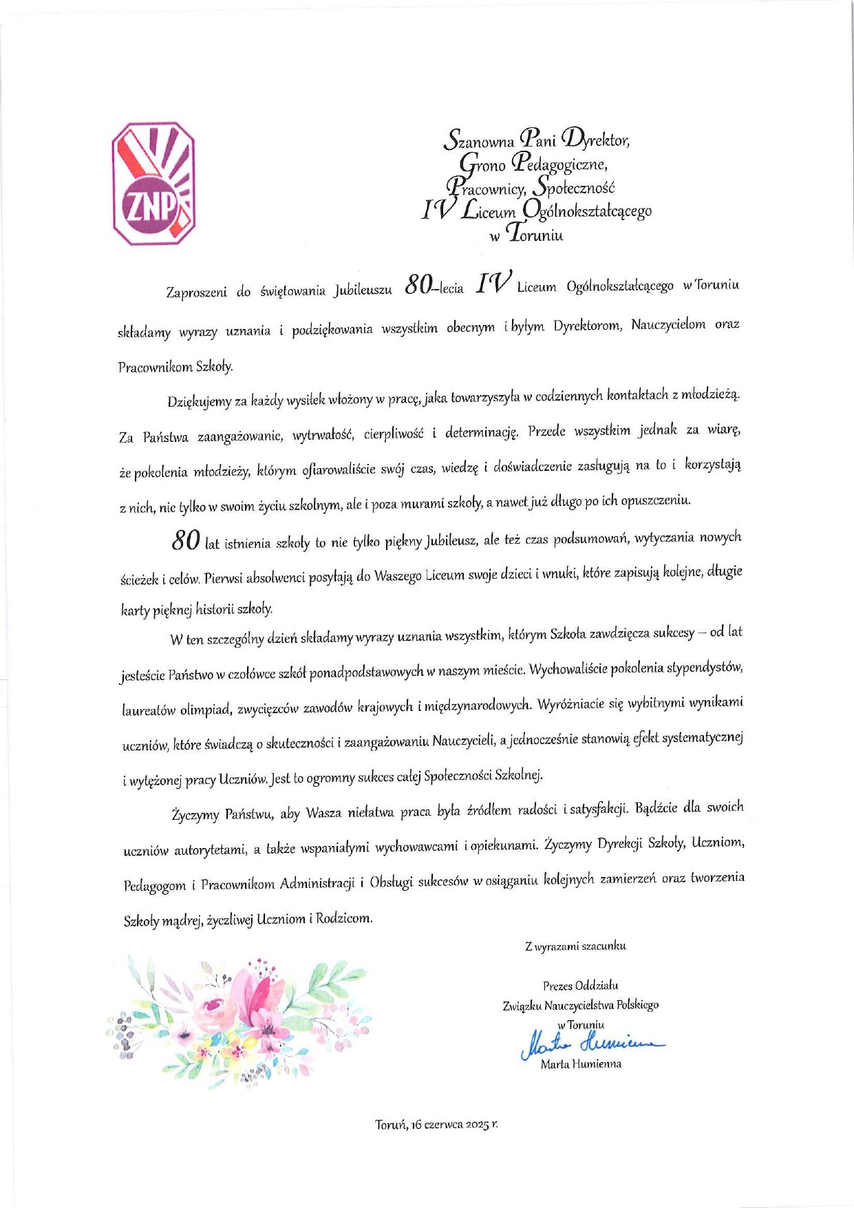Z okazji 80-lecia naszej szkoły otrzymaliśmy wiele ciepłych słów, gratulacji i wyrazów uznania od instytucji, władz i przyjaciół szkoły. Część z nich prezentujemy w poniższej galerii – z dumą i wdzięcznością…