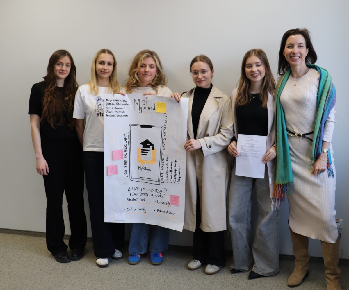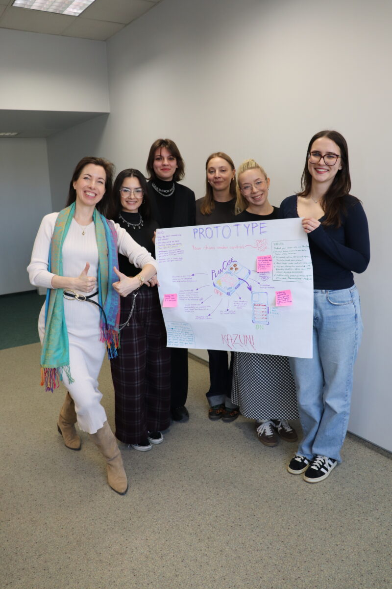 Na zakończenie zajęć studenci zaprezentowali efekty swojej pracy, uwzględniając w prezentacjach modyfikacje wynikające z otrzymanego feedbacku. Ćwiczenie pozwoliło uczestnikom przejść przez najważniejsze etapy procesu Design Thinking – od zrozumienia problemu użytkownika, przez generowanie pomysłów i prototypowanie, po testowanie rozwiązań.