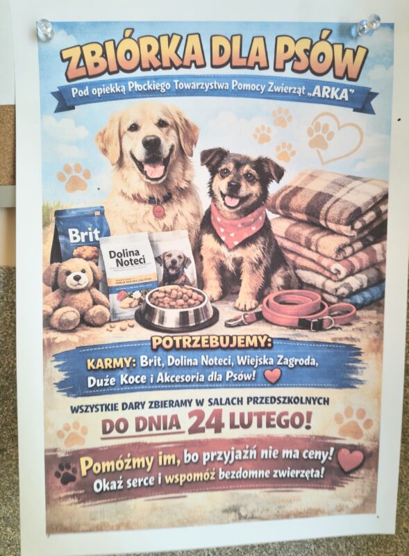 Do 24 lutego 2026 roku prowadzimy zbiórkę darów dla psów objętych opieką Płockiego Towarzystwa Pomocy Zwierząt „ARKA”. Potrzebne są przede wszystkim karmy, koce oraz akcesoria dla psów. Wszystkie szczegóły dotyczące zbiórki znajdują się na plakacie. Zachęcamy do udziału w zbiórce na rzecz bezdomnych zwierząt.