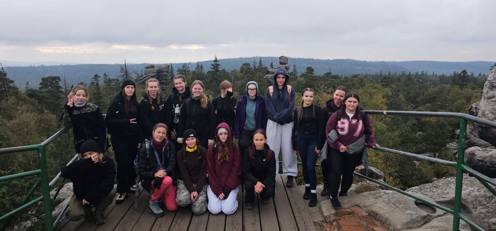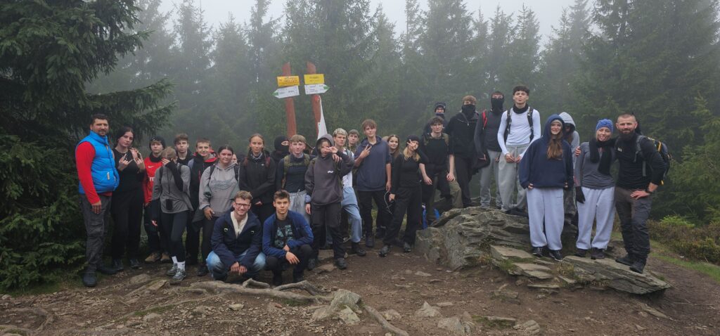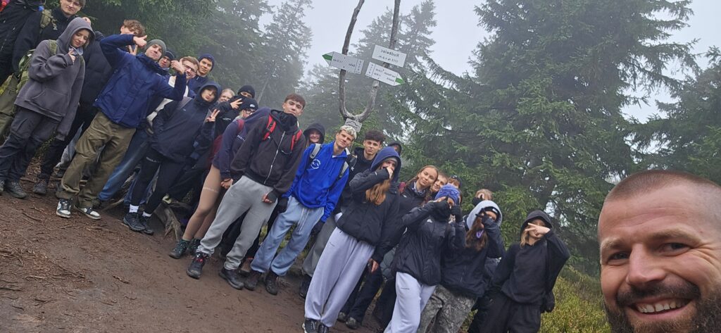 29.09 – 02.10.2025 r. uczniowie I Liceum Ogólnokształcącego im. Tadeusza Kościuszki w Dąbrowie Tarnowskiej wraz z opiekunami p. Olgą Kopałą, p. Arkadiuszem Chwałkiem oraz p. Pawłem Luberą zdobyli kolejne szczyty należące do Korony Gór Polski. Tym razem wspinaliśmy się po szczytach Kotliny Kłodzkiej. Czterodniową wycieczkę rozpoczęliśmy od zaliczenia szczytów Kowadło oraz Rudawiec. Kowadło ma wysokość 989 m n.p.m., odnajdziecie je skryte na końcu świata w sudeckiej krainie, jest reprezentantem Gór Złotych, natomiast Rudawiec (1112 m n.p.m.) jest najwyższym szczytem Gór Bialskich w Koronie Gór Polski. Drugiego dnia zmierzyliśmy się z zachodnią częścią Kotliny Kłodzkiej. Na początek góra Jagodna, czyli Heidelberg, mierząca 977 m n.p.m., to prawie najwyższy szczyt Gór Bystrzyckich. Przez Jagodną przemyka szlak i to na Jagodnej jest ustawiona całkiem zgrabna wieża widokowa, co za tym idzie, to ona tutaj rozdaje karty. Następnie udaliśmy się na najwyższy szczyt Gór Orlickich- Orlicę (1084 m n.p.m.)- choć jej wierzchołek znajduje się kilkanaście metrów za polską granicą. Potwierdzamy, iż na szczyt prowadzi spokojny szlak. Trzecie wyjście naszego drugiego dnia to Szczeliniec Wielki ( 922 m n.p.m.) Jest najwyższym szczytem Gór Stołowych. Trasa nie jest ani trudna, ani czasochłonna, za to widokowa, pasjonująca, owiana tajemnicą Skalnego Labiryntu. Trasa przemyka przez głębokie szczeliny i schodzi do samych czeluści piekielnych! Trzeci dzień naszej wyprawy to zdobycie Śnieżnika, który w księgach ma zapisane 1423 m n.p.m. To najwyższy szczyt polskich Sudetów Wschodnich i Masywu Śnieżnika, w którym zajmuje centralne miejsce. Czasami w annałach widnieje pod inną, nieco mniej znaną nazwą Śnieżnik Kłodzki lub pod dawniejszą nazwą Kładska Śnieżka. Choć pogoda nam nie dopisała, daliśmy radę, a „na liczniku”- 20 km. Ostatni nasz dzień to zdobycie Kłodzkiej Góry. Wysoka na 757 m n.p.m. jest drugim co do wysokości szczytem Gór Bardzkich, a ponieważ przez lata Kłodzka Góra była wskazywana jako najwyższy wierzchołek tutejszych gór, dopisano ją do zacnego towarzystwa Korony Gór Polski. Zmęczeni, z obolałymi nogami i drobnymi odciskami, w cztery dni pokonaliśmy trasę 52 km, zdobywając siedem szczytów, a fakt zdobycia potwierdziliśmy pieczątkami.