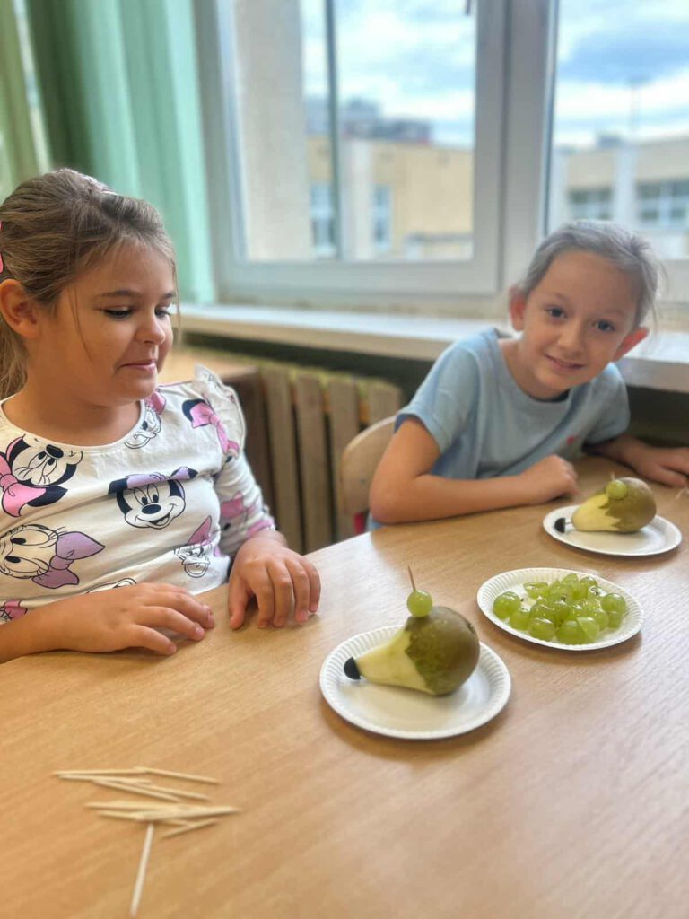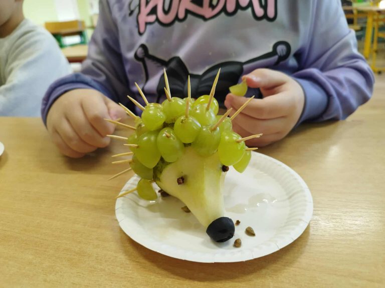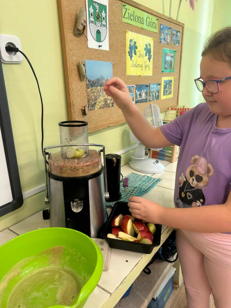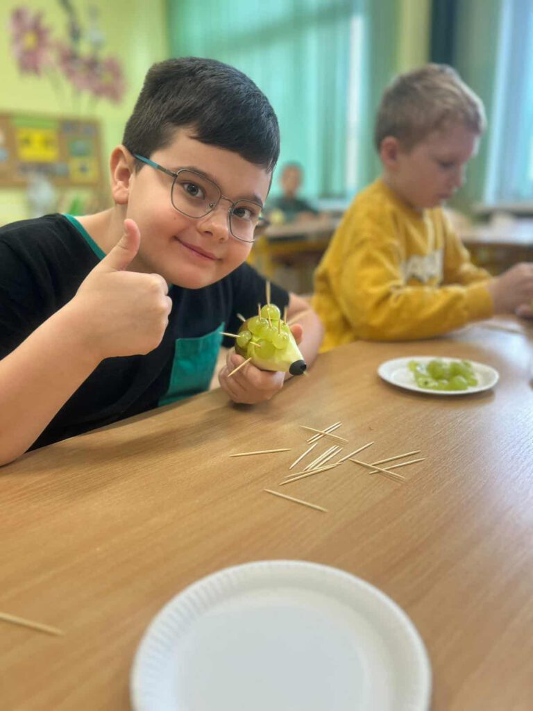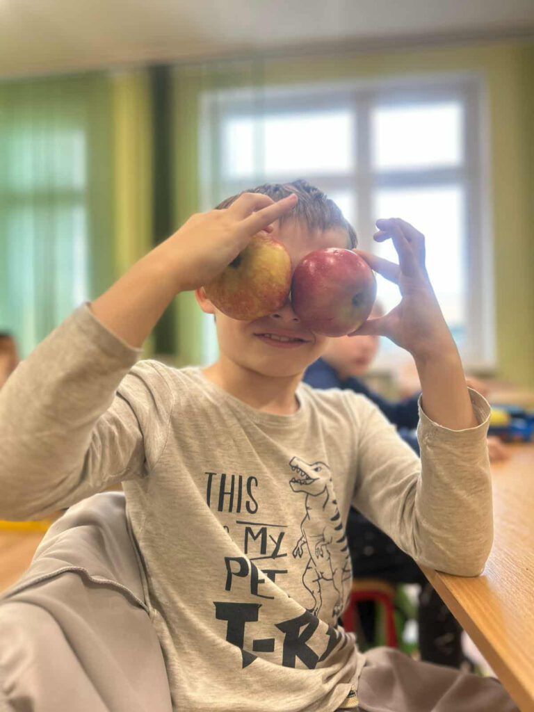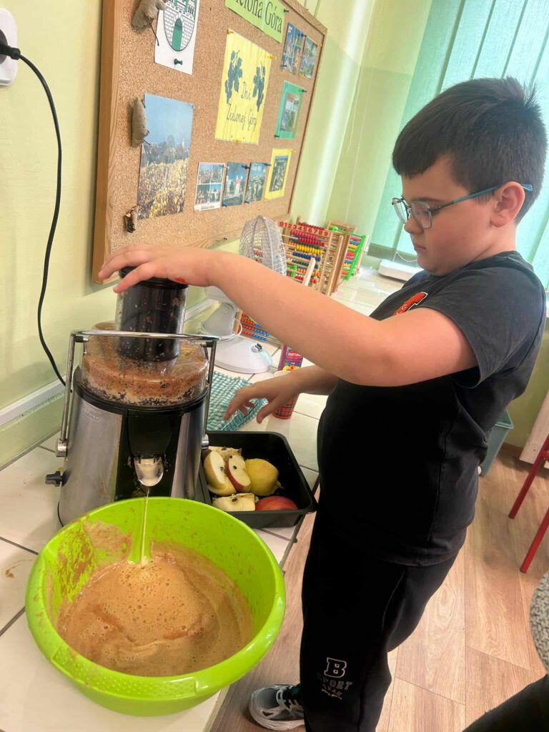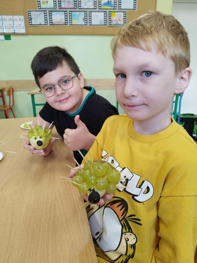 We wrześniu uczniowie klasy 2d uczestniczyli w klasowym projekcie pod nazwą „W świecie owoców i warzyw”. Przez kilka dni poznawali i omawiali adekwatności, budowę oraz możliwości przetwarzania owoców i warzyw. Poznali piramidę zdrowego żywienia i aktywności fizycznej oraz wiersz „Na straganie”, samodzielnie wykonali owocowego jeża, którego później ze smakiem zjedli, wykonali tematyczne prace plastyczne oraz w ramach Dnia Jabłka, który był częścią projektu, samodzielnie wykonali sok z jabłek, poznając jednocześnie zasady działania sokowirówki.