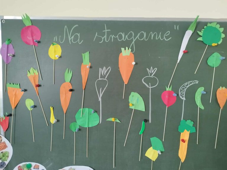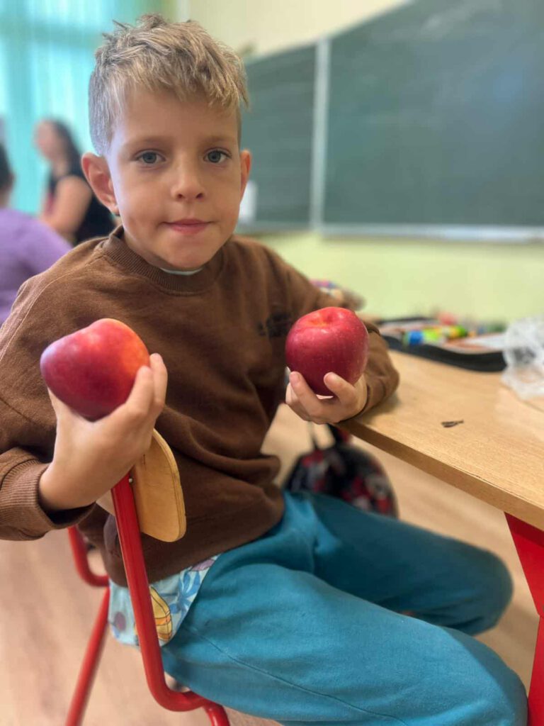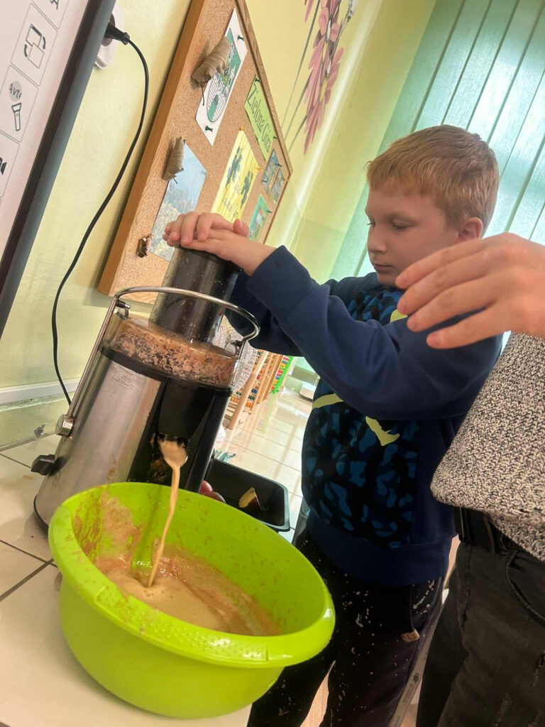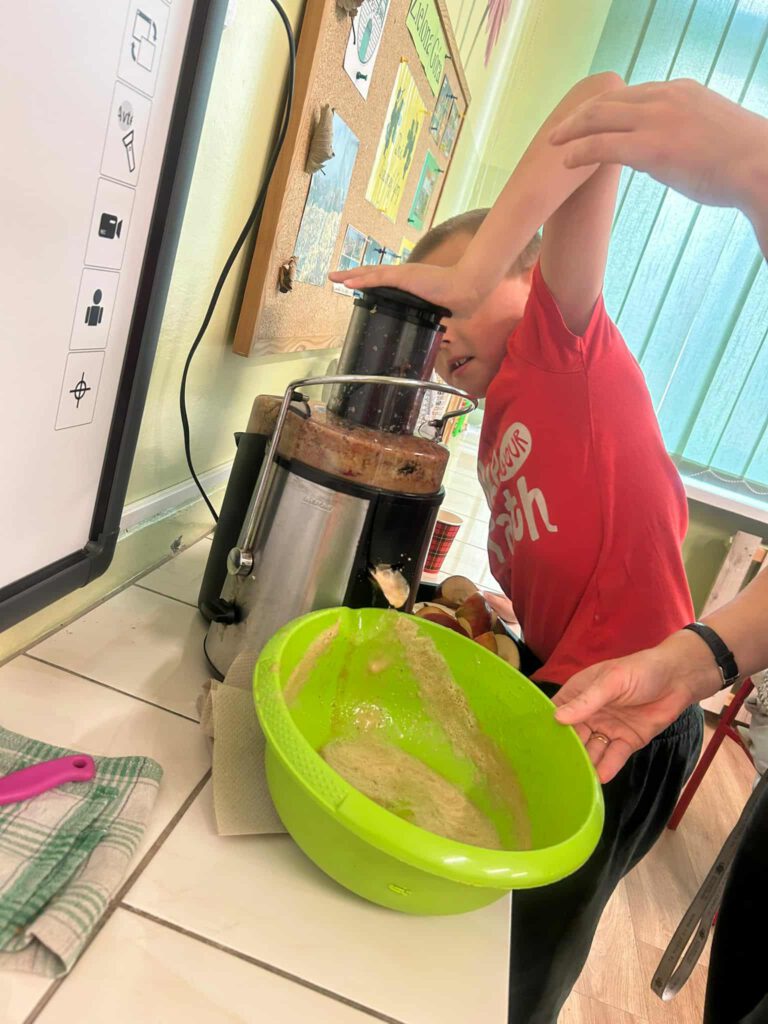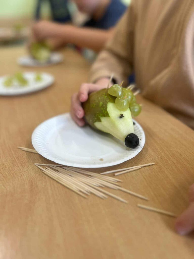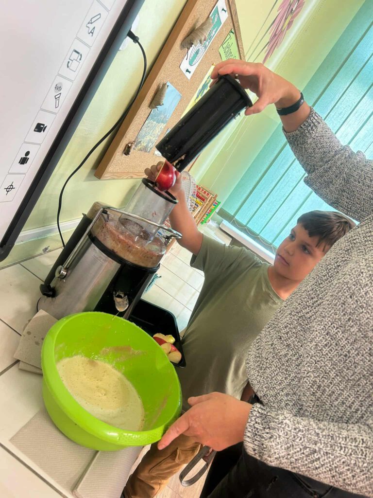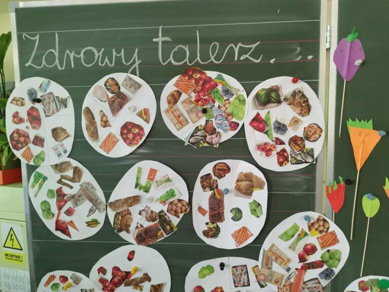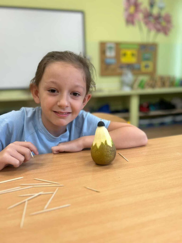We wrześniu uczniowie klasy 2d uczestniczyli w klasowym projekcie pod nazwą „W świecie owoców i warzyw”. Przez kilka dni poznawali i omawiali adekwatności, budowę oraz możliwości przetwarzania owoców i warzyw. Poznali piramidę zdrowego żywienia i aktywności fizycznej oraz wiersz „Na straganie”, samodzielnie wykonali owocowego jeża, którego później ze smakiem zjedli, wykonali tematyczne prace plastyczne oraz w ramach Dnia Jabłka, który był częścią projektu, samodzielnie wykonali sok z jabłek, poznając jednocześnie zasady działania sokowirówki.