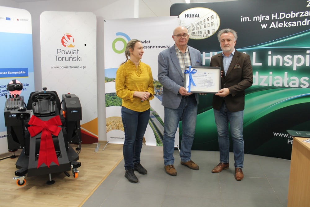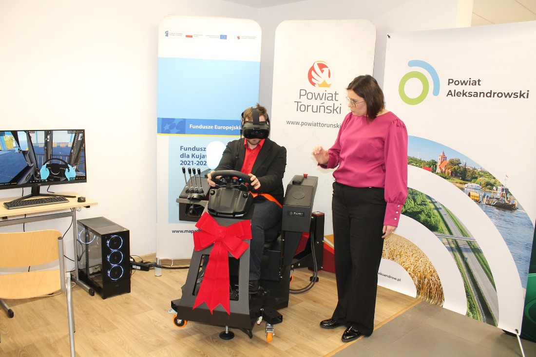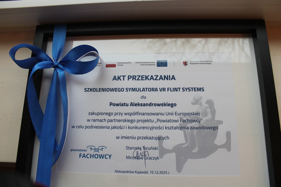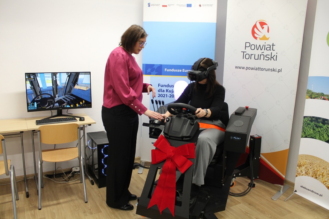 W poniedziałek 15.12.2025 r. nastąpiło oficjalne przekazanie sprzętu zakupionego w ramach projektu trzech powiatów – Powiatowi Fachowcy, którego liderem jest Powiat Toruński. Nasza szkoła została doposażona w Symulator VR – wózek widłowy 8t i Reach Stacker na platformie ruchu Perun Lite Drive, za pomocą którego nasza młodzież będzie mogła kształcić umiejętności w zawodzie technik logistyk oraz zdobywać nowe kompetencje.