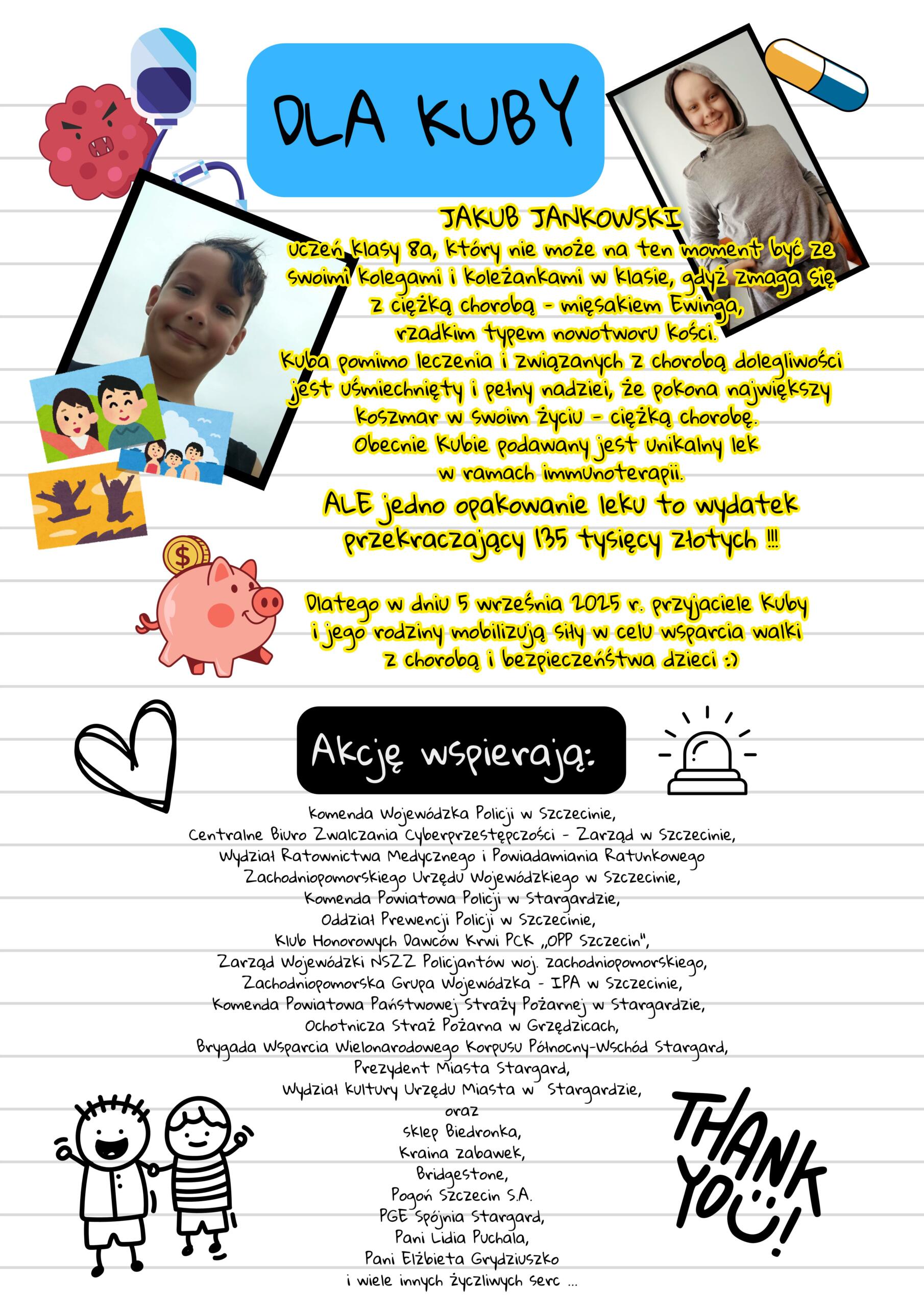 Podczas festynu zbierane będą środki na leczenie Kuby – ucznia Siódemki, który walczy z rzadkim nowotworem kości. Chłopiec walczy o zdrowie, w czym pomaga mu unikalny lek. Jedno opakowanie kosztuje ponad 135 000 zł.