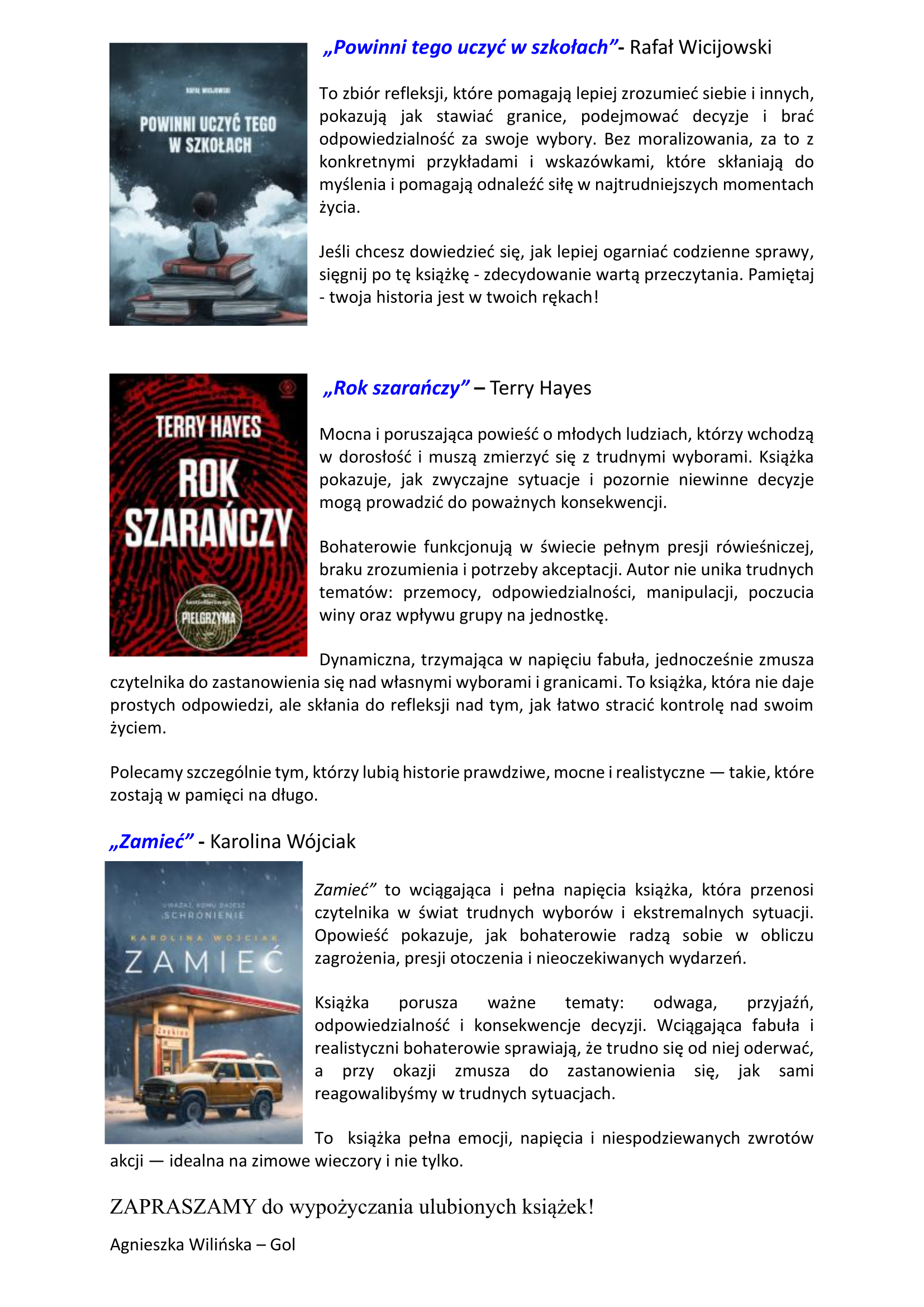 Świąteczna przerwa to idealny czas, by odetchnąć od codziennych obowiązków, odpocząć i… sięgnąć po dobrą książkę! W naszej bibliotece pojawiły się nowości, które wciągną Cię od pierwszych stron i pozwolą przeżyć niezapomniane historie – pełne emocji, przygód, refleksji i świątecznego ciepła.