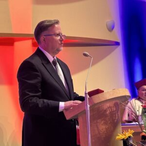 – Nasz uniwersytet ma potencjał i korzysta z tego potencjału, aby być liderem w wielu dziedzinach. Dobrze iż jest to potwierdzone przez międzynarodowe rankingi. To cieszy – podkreślił Maciej Wujec. – Kieruję wyrazy szacunku w państwa stronę w kontekście zarządzania. Umiecie skutecznie aplikować skutecznie o środki zewnętrzne. W tym mieści się duży projekt z programu KPO. Myślę, iż to będą jedne z najlepiej wydanych z tego funduszu pieniędzy. Serdecznie tego gratuluję.