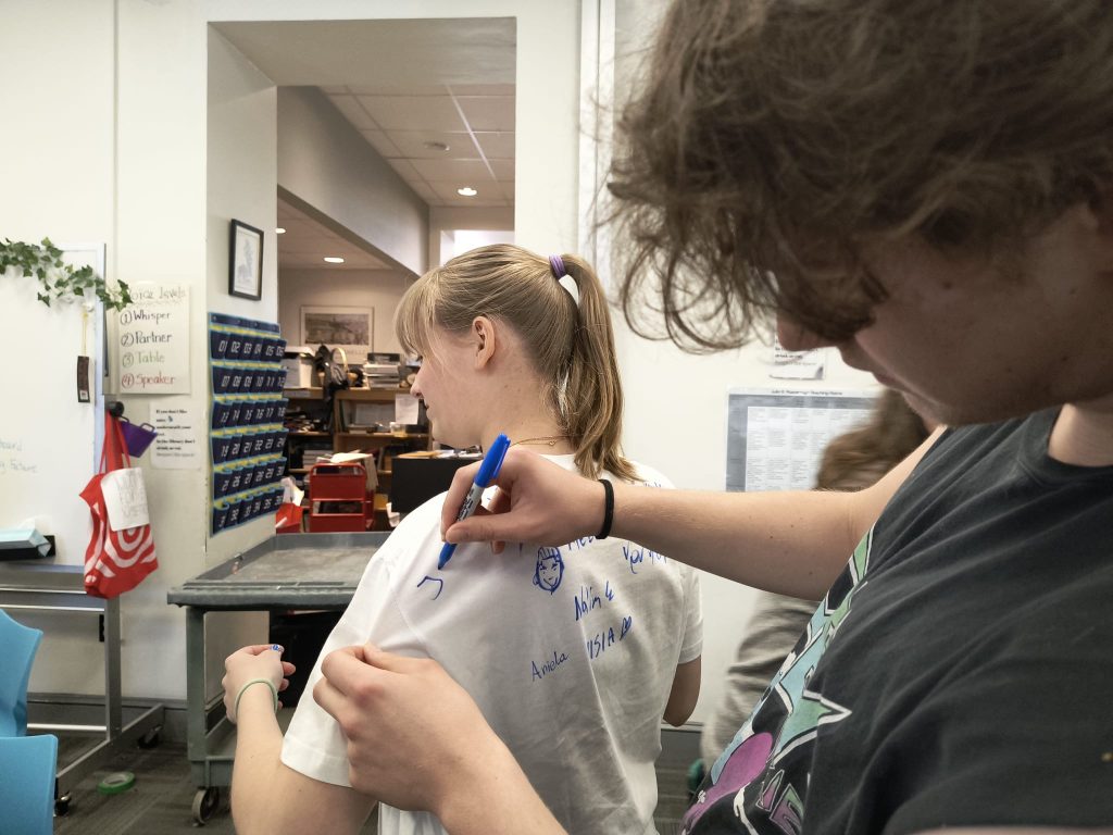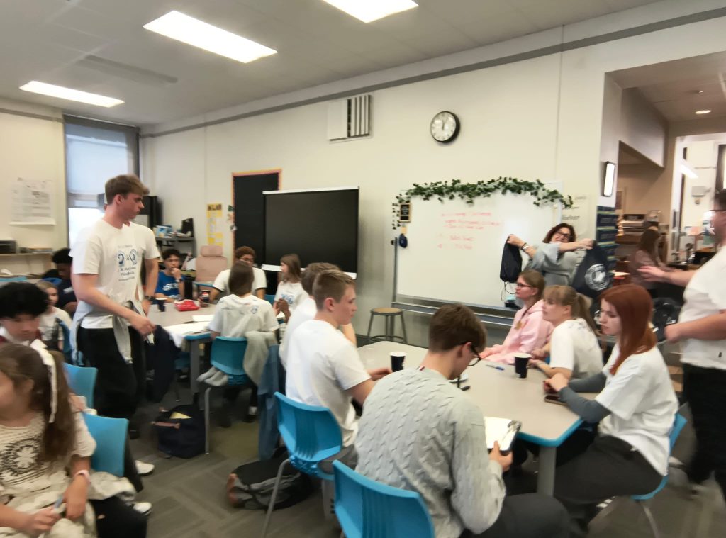 Dzisiaj, w dniu naszego wyjazdu, zasiedliśmy razem na lunch w szkolnej sali – pełnej śmiechu, ciepła i emocji! Uczniowie z entuzjazmem podpisywali sobie nawzajem koszulki markerami, wspominając niezapomniane chwile z wymiany, nowo zawarte przyjaźnie i te wszystkie szalone przygody, które nas połączyły.